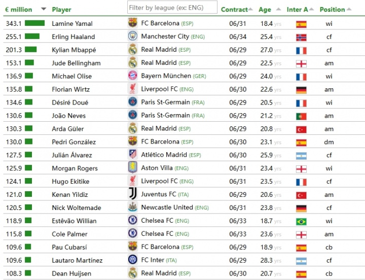 CIES转会价值排名:亚马尔3.43亿第一,哈兰德2.55亿,姆巴佩2亿